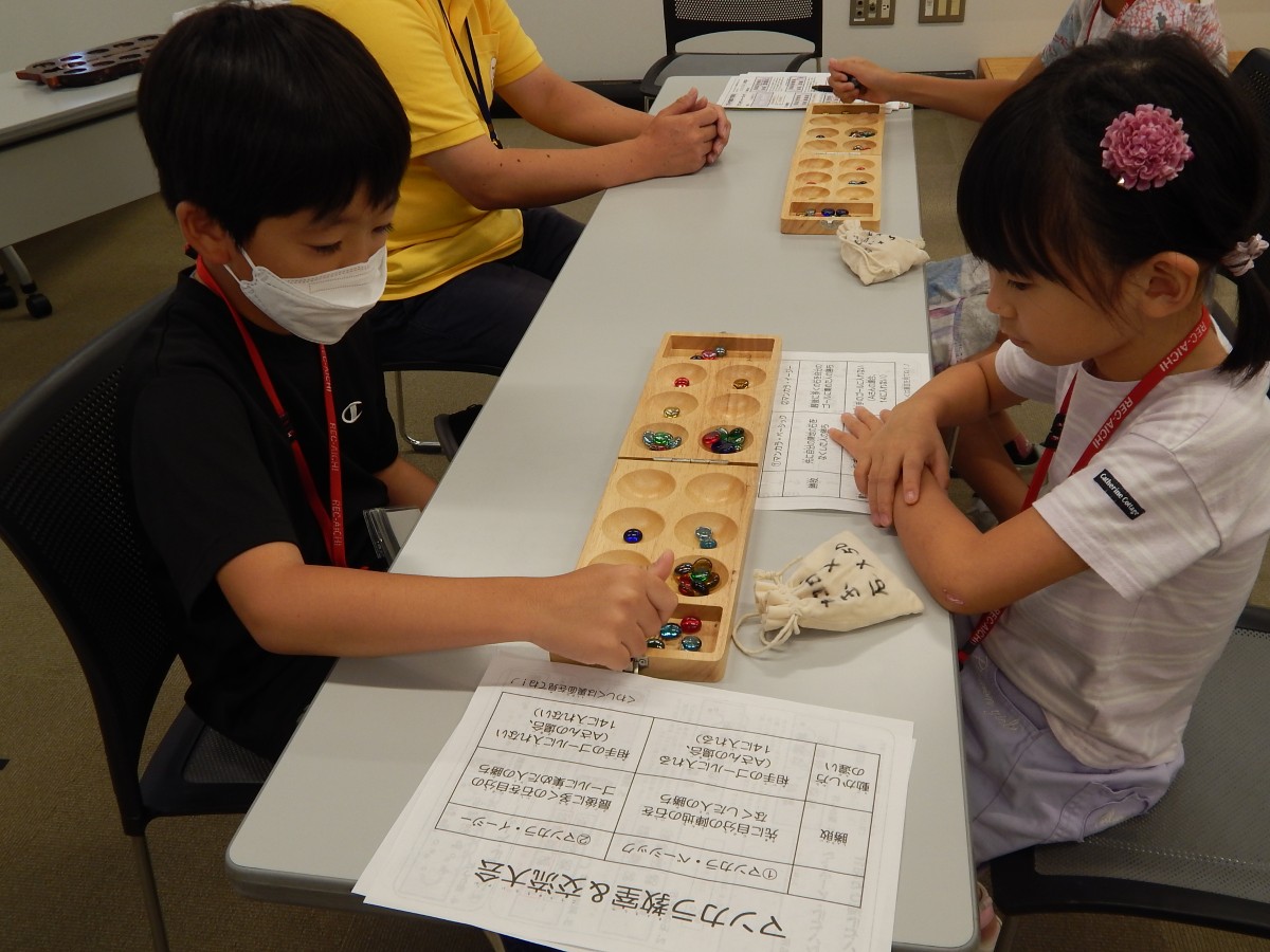2023年8月20日 刈谷市マンカラ教室&マンカラ交流大会 刈谷市総合文化センター内 中央生涯学習センター 延べ18名が参加。午前にベーシック、イージーのルールを学び、午後からは大会を開催。参加者は、ほぼ小学生。2回目の参加、児童クラブで経験していた子どもたちが多く、手際よくゲームを進めていました。「また、リベンジしたい」など次回を楽しみにしている声も聞こえてきました